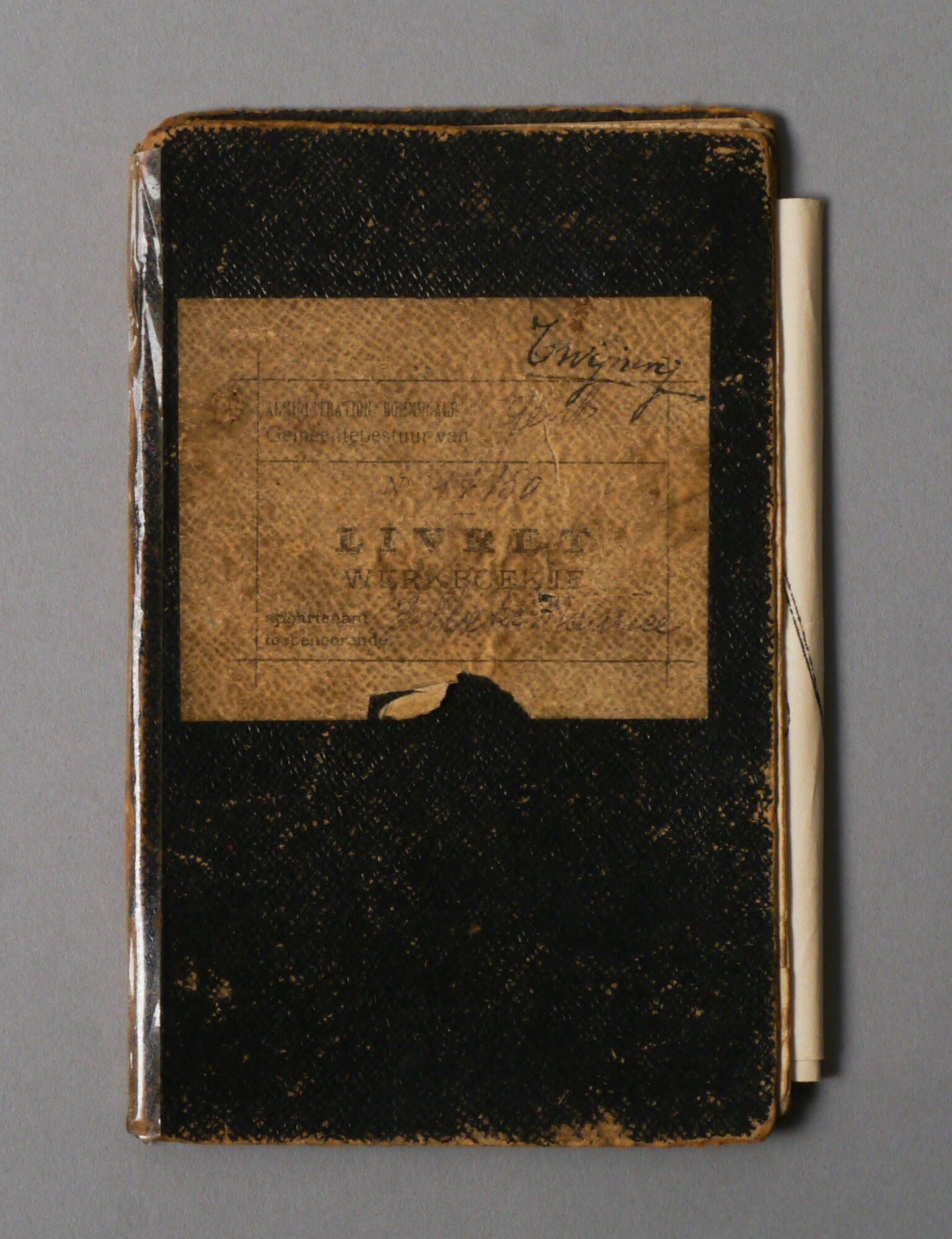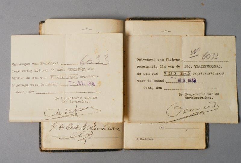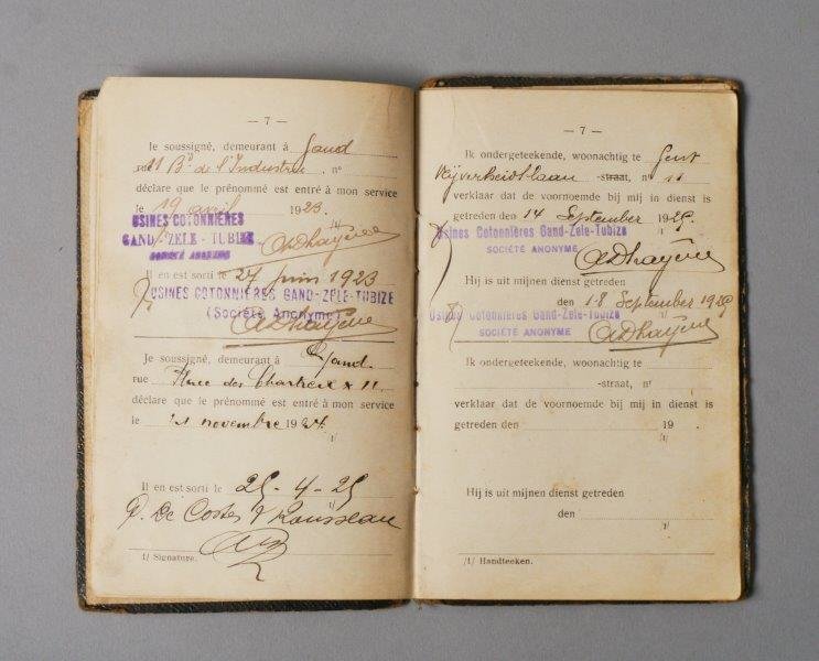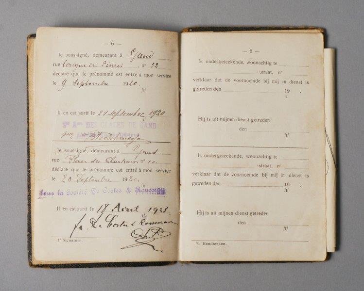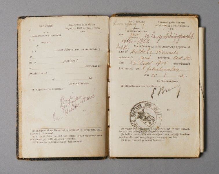 Werkboekje uitgereikt door gemeentebestuur van Gent aan Maurits Delbeke, geboren op 25 augustus 1906, man, 14 jaar, fabriekwerker. Datum van afgifte van het boekje: 20/08/1920. Nummer van het boekje: 14/50. Datum van eerste indiensttreding: 9/09/1920. Werkgevers: SA Des Places De Gand (9/09/1920-21/09/1920); Sous la Société De Coster & Rousseau (20/09/1920-18/04/1923); Usines Cotonniéres Gand-Zele-Tubize (19/04/1923-27/061923); Place des Chartreux 11 (21/11/1927-29/04/1929); Usines Cotonnières Gand-Zele-Tubize (14/09/1929-18/09/1929).
