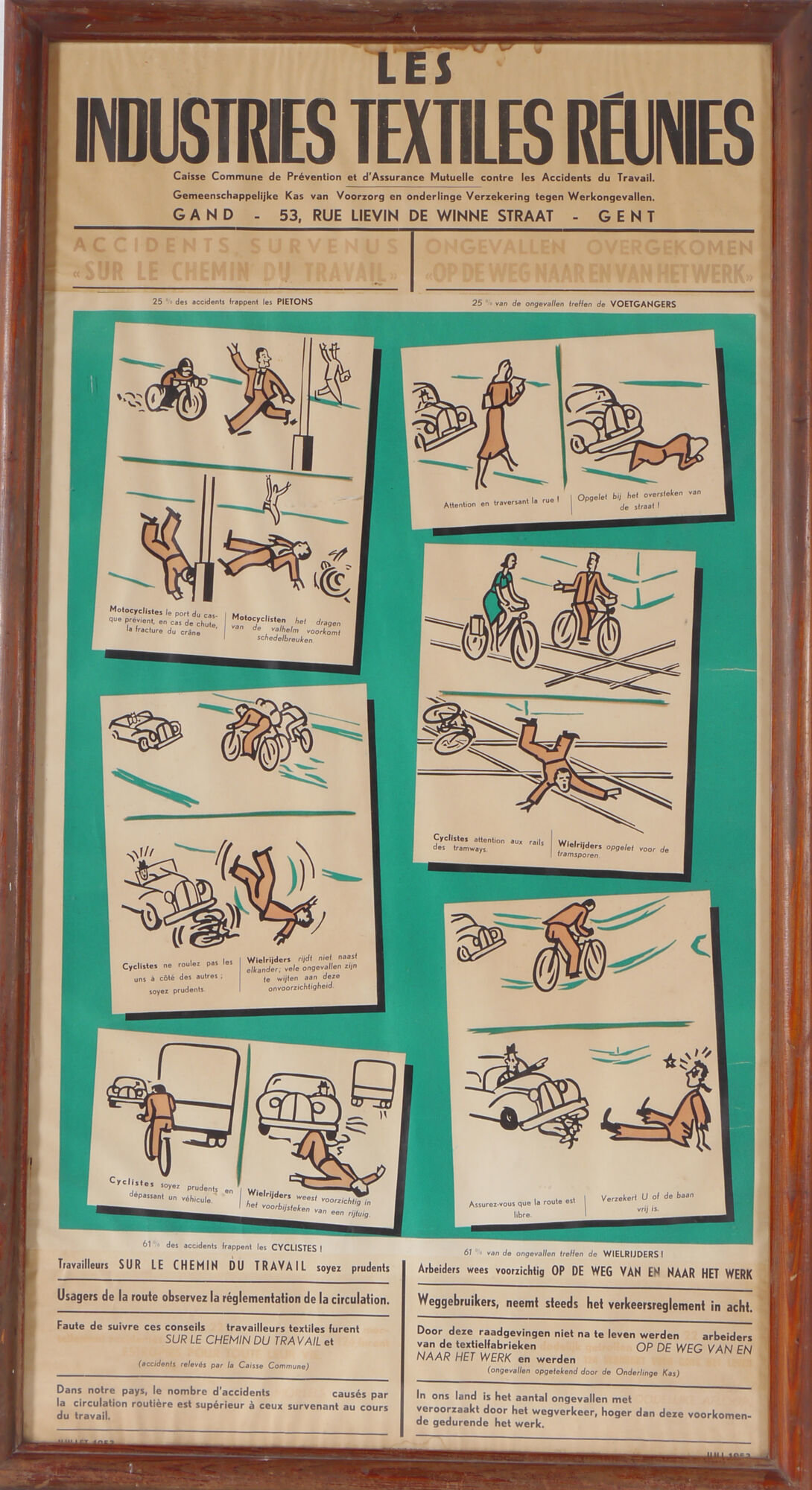#glas #papier #hout #werken #3de kwart 20ste eeuw #affiche #textielindustrie #Verenigde Textielnijverheden. Gemeenschappelijke Kas van Voorzorg en onderlinge Verzekering tegen Werkongevallen #arbeidsveiligheid en welzijn #Staelens #Les Industries Textiles Réunies
