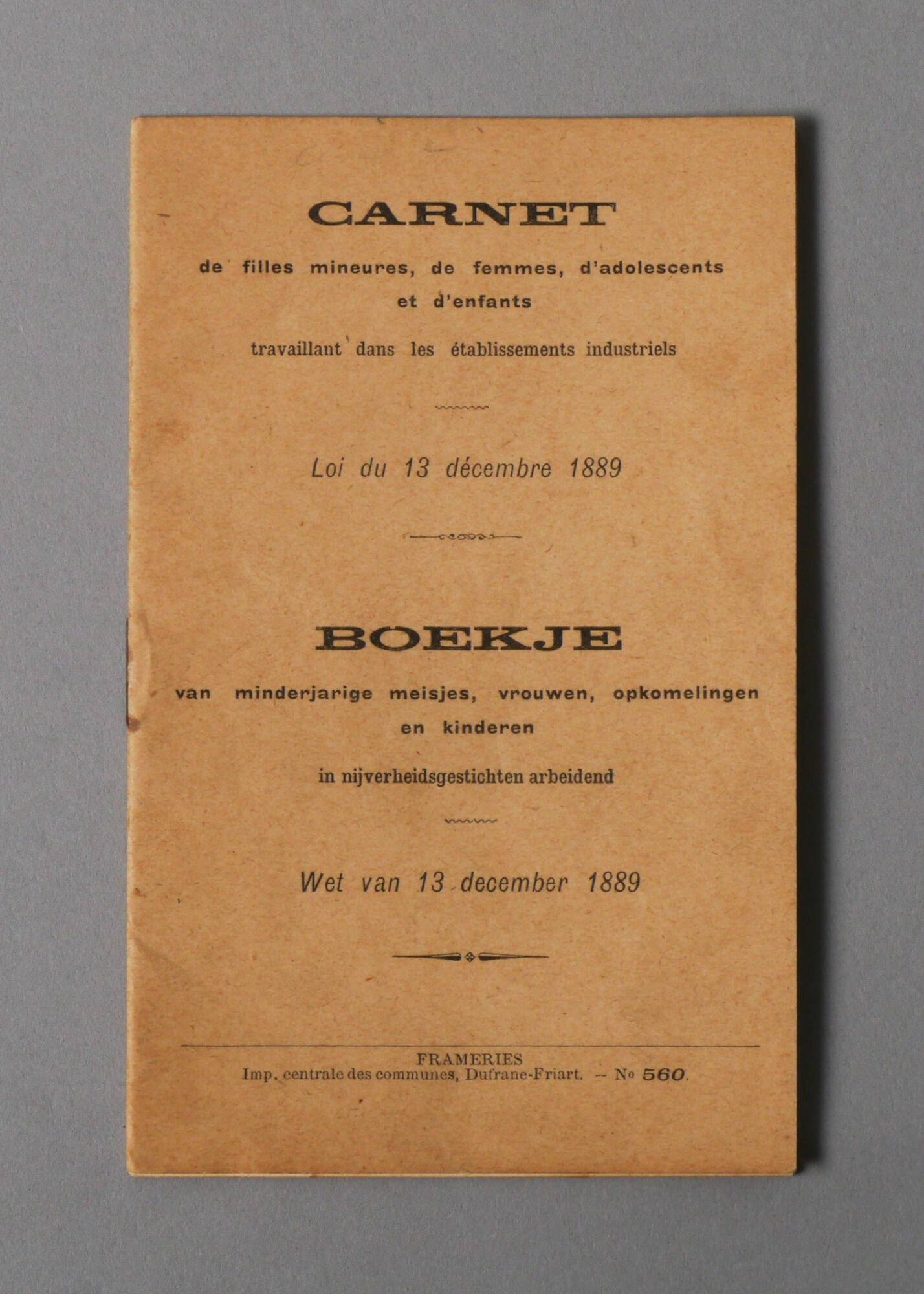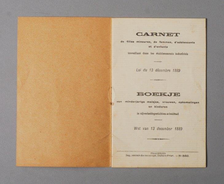 - opschriften: Carnet/de filles mineures, de femmes, d' adolescents/ et d'enfants/travaillant dans les établissements industriels/ Loi du 13 décembre 1889/ BOEKJE/van minderjarige meisjes, vrouwen , opkomelingen en kinderen/in nijverheisgestichten arbeidend/wet van 13 d