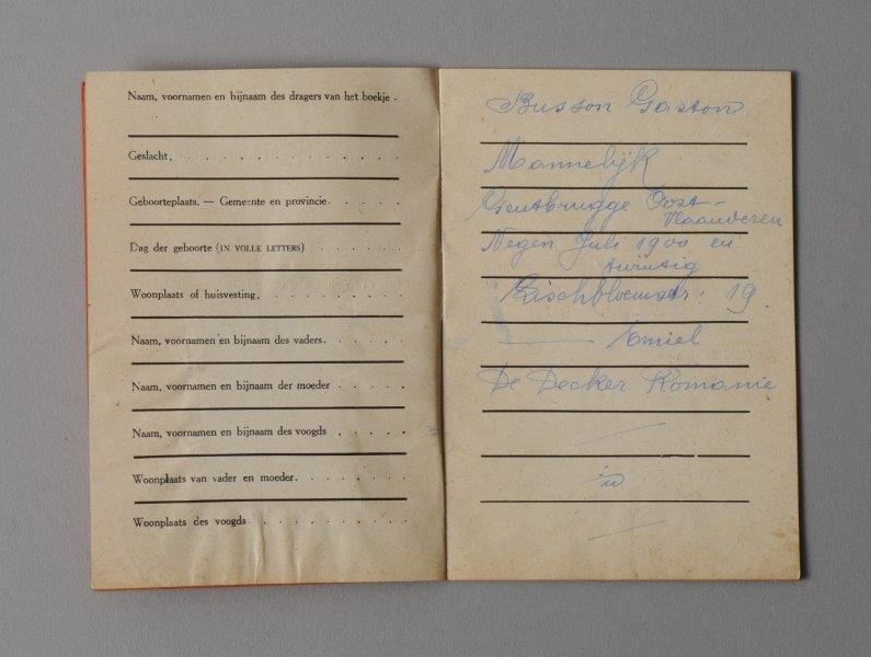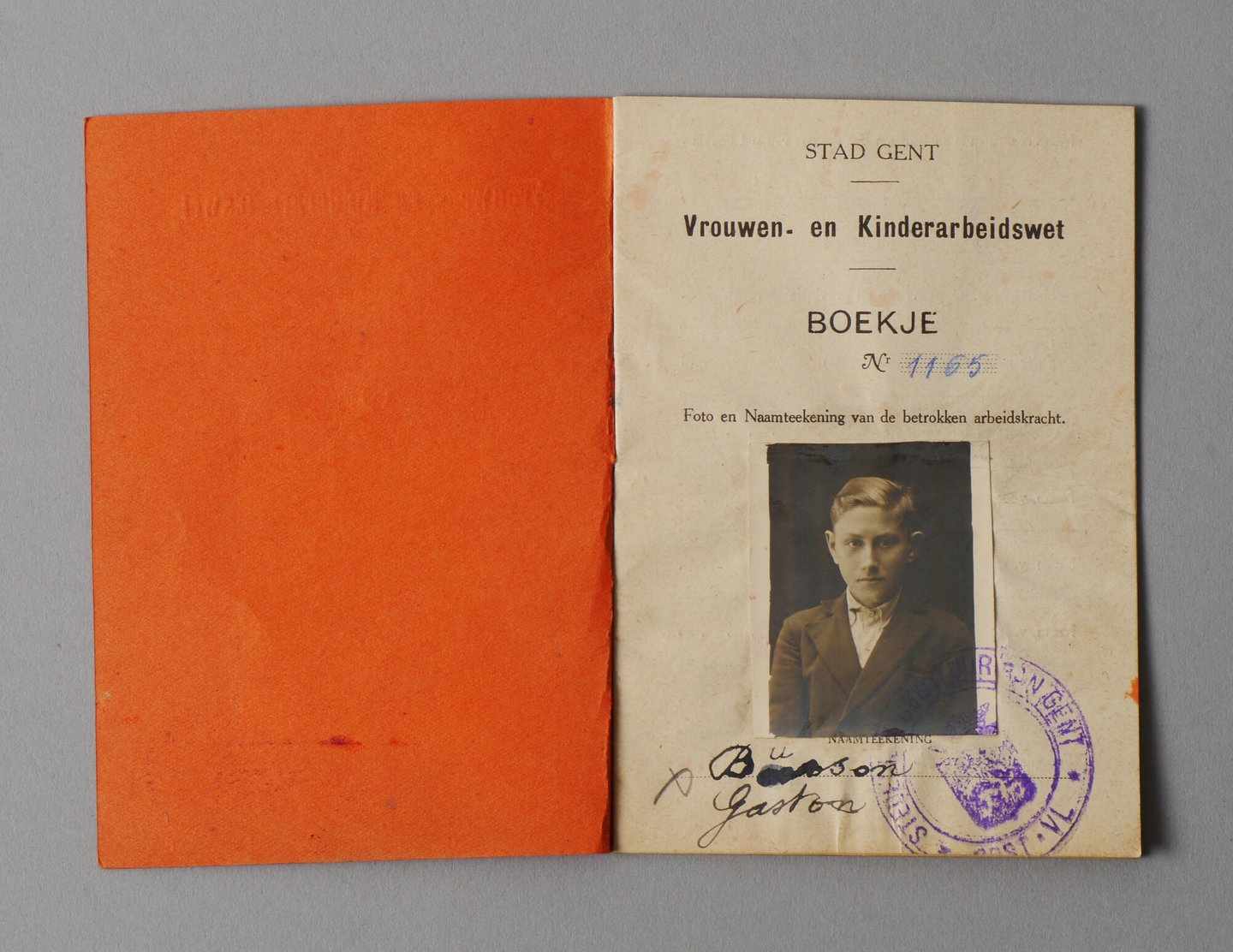 Vrouwen- en kinderarbeidswetboekje uitgereikt door gemeentebestuur van Gent aan Gaston Busson, geboren op 9 juli 1920, man, 14 jaar. Datum van afgifte van het boekje: 28/07/1934. Nummer van het boekje: 1165.