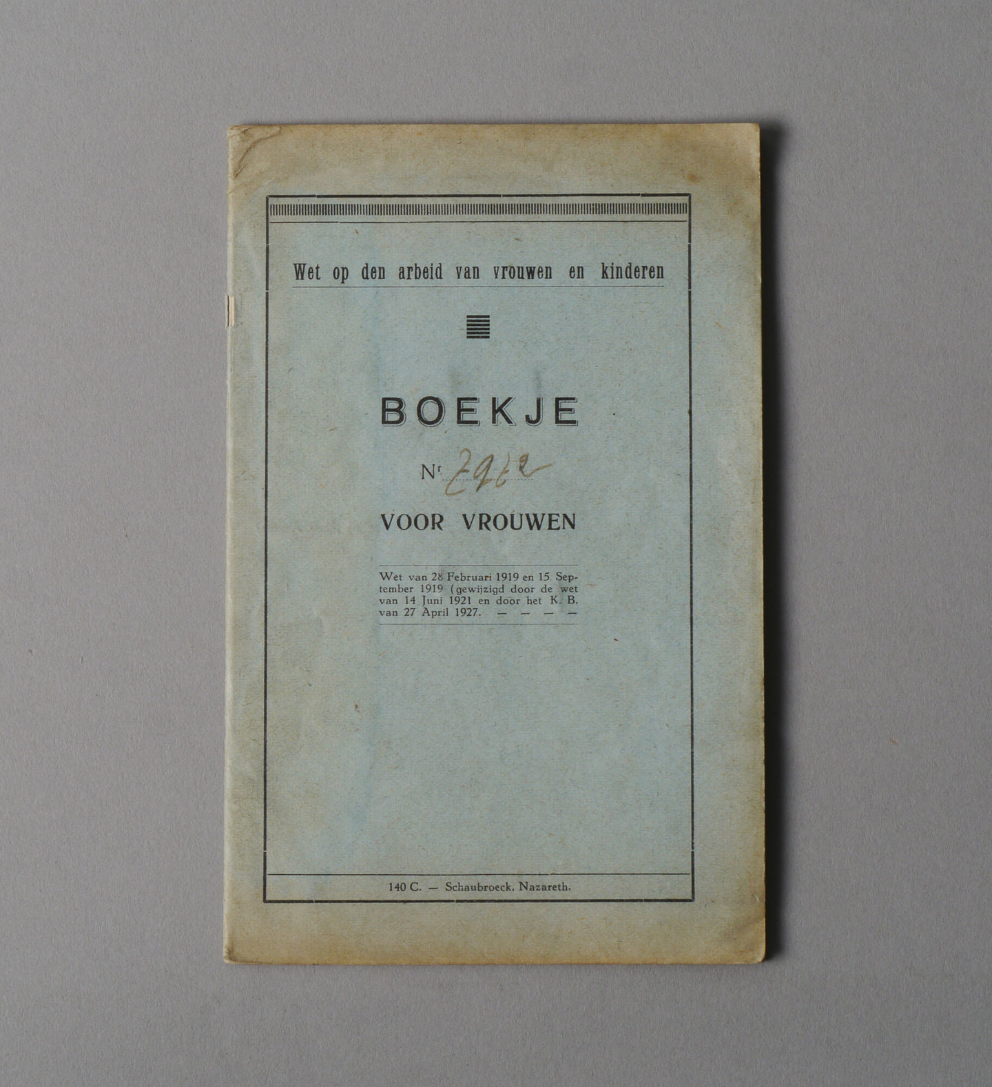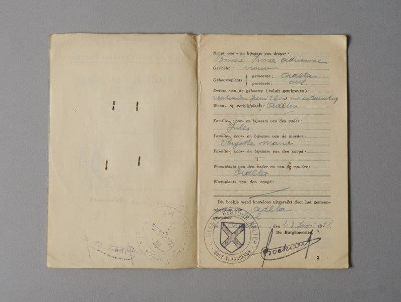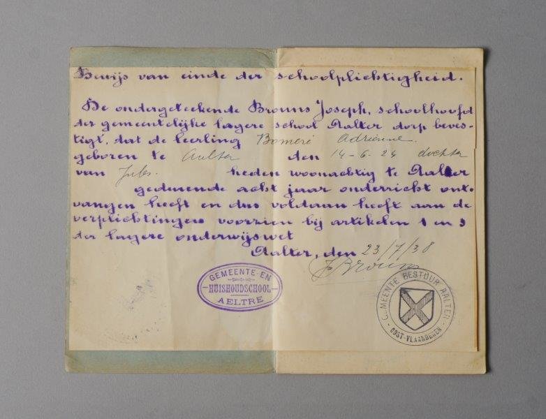 Vrouwen- en kinderarbeidswetboekje uitgereikt door gemeentebestuur van Aalter aan Irma Adrienne Bomeré, geboren op 14 juni 1924, vrouw, 14 jaar. Datum van afgifte van het boekje: 23/06/1938. Nummer van het boekje: 2972. Het boekje bevat een bewijs van einde der schoolplichtigheid.
