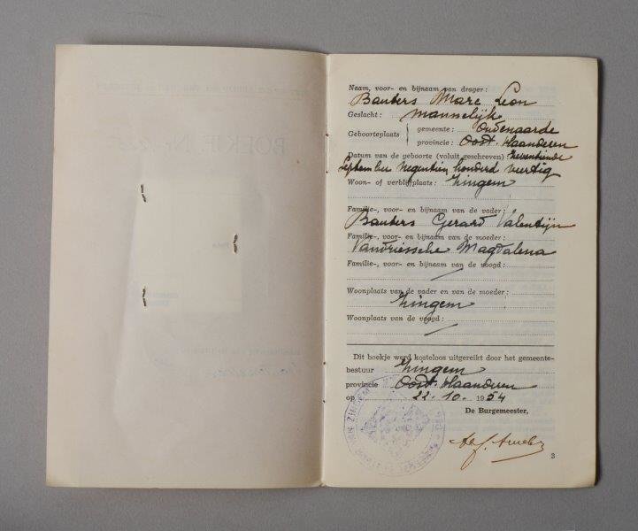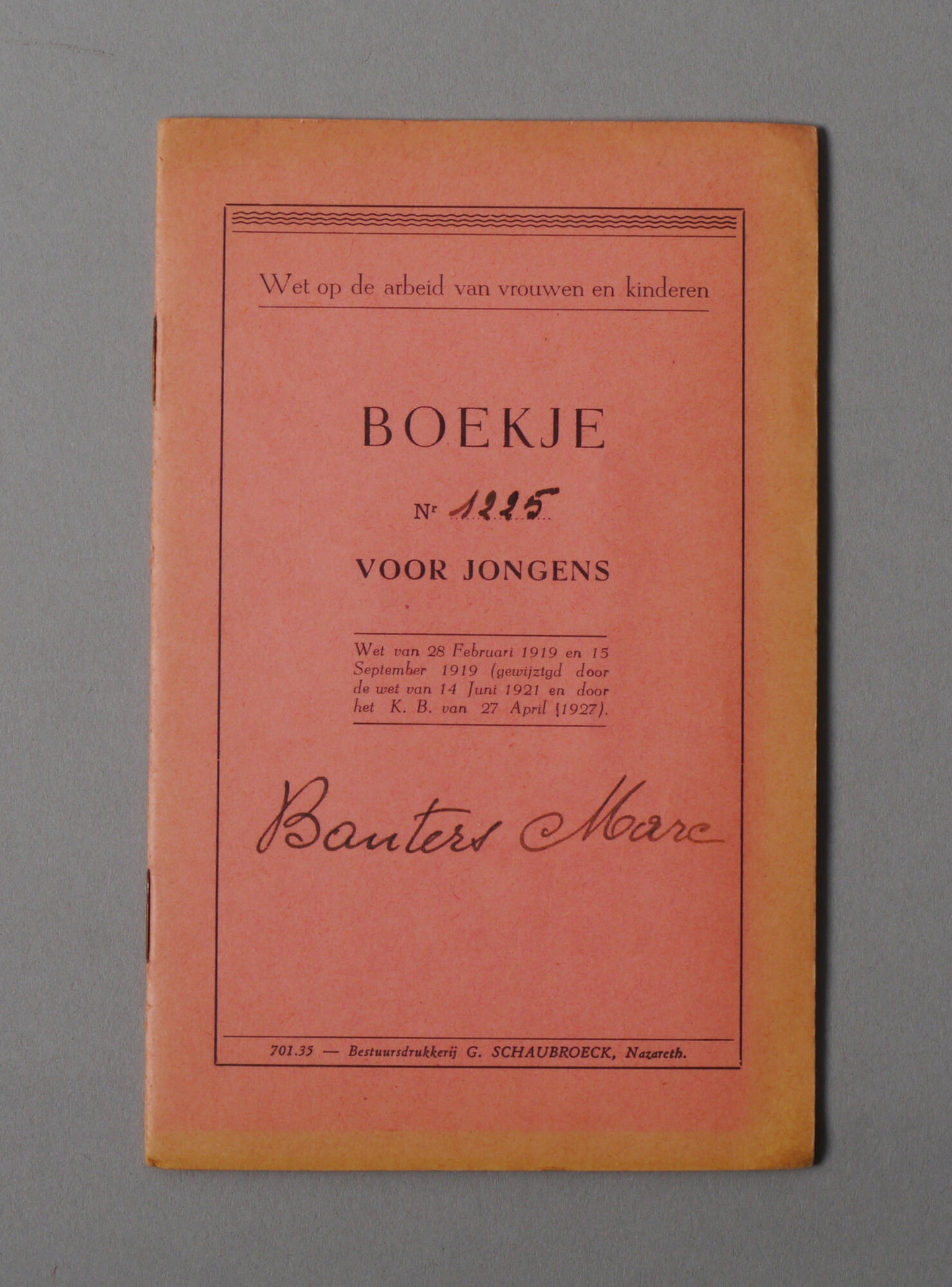 Vrouwen- en kinderarbeidswetboekje uitgereikt door gemeentebestuur van Zingem aan Marc Leon Bauters, geboren op 17 september 1940, man, 14 jaar. Datum van afgifte van het boekje: 22/10/1954. Nummer van het boekje: 1225.
