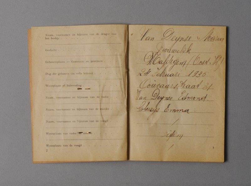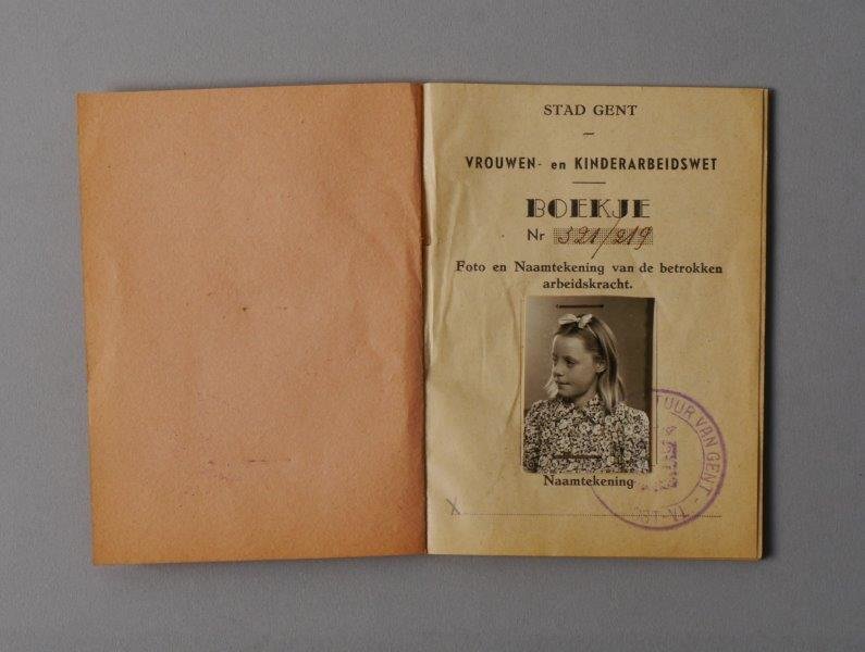 Vrouwen- en kinderarbeidswetboekje uitgereikt door gemeentebestuur van Gent aan Maria Van Deynse, geboren op 24 februari 1935, vrouw, 14 jaar. Datum van afgifte van het boekje: 23/08/1949. Nummer van het boekje: 321/219.