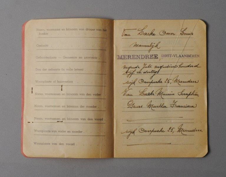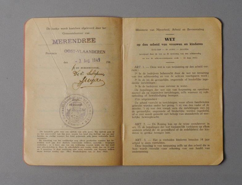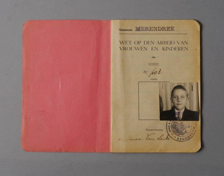 Vrouwen- en kinderarbeidswetboekje uitgereikt door gemeentebestuur van Merendree aan Omer Louis Van Lacke, geboren op 9 juli 1935, man, 14 jaar. Datum van afgifte van het boekje: 03/08/1949. Nummer van het boekje: 463.