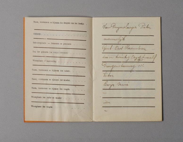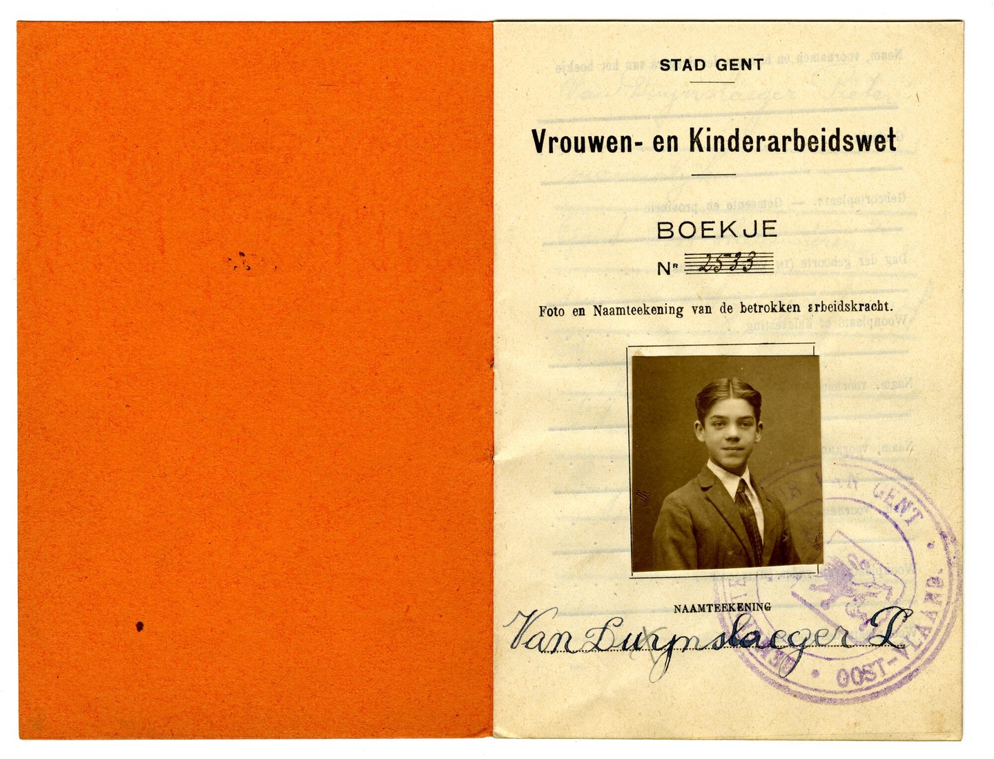 Vrouwen- en kinderarbeidswetboekje uitgereikt door gemeentebestuur van Gent aan Pieter Van Duynslaeger, geboren op 23 augustus 1912, man, 14 jaar. Datum van afgifte van het boekje: 23/08/1926. Nummer van het boekje: 2533.
