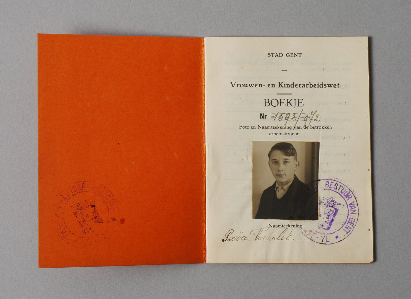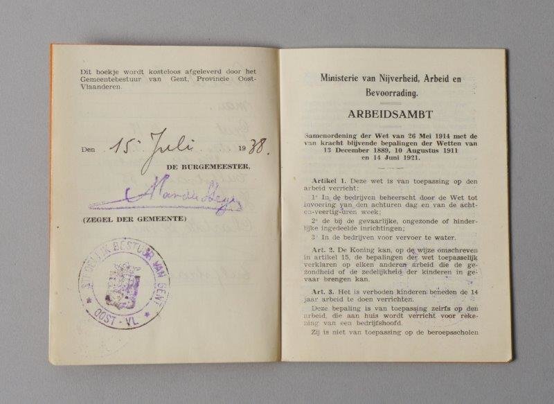 Vrouwen- en kinderarbeidswetboekje uitgereikt door gemeentebestuur van Gent aan Pieter Verhelst, geboren op 13 maart 1924, man, 14 jaar. Datum van afgifte van het boekje: 15/07/1938. Nummer van het boekje: 1592/972.