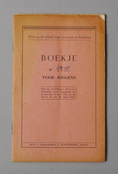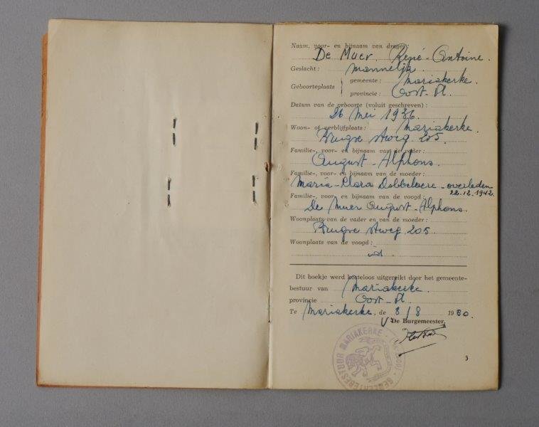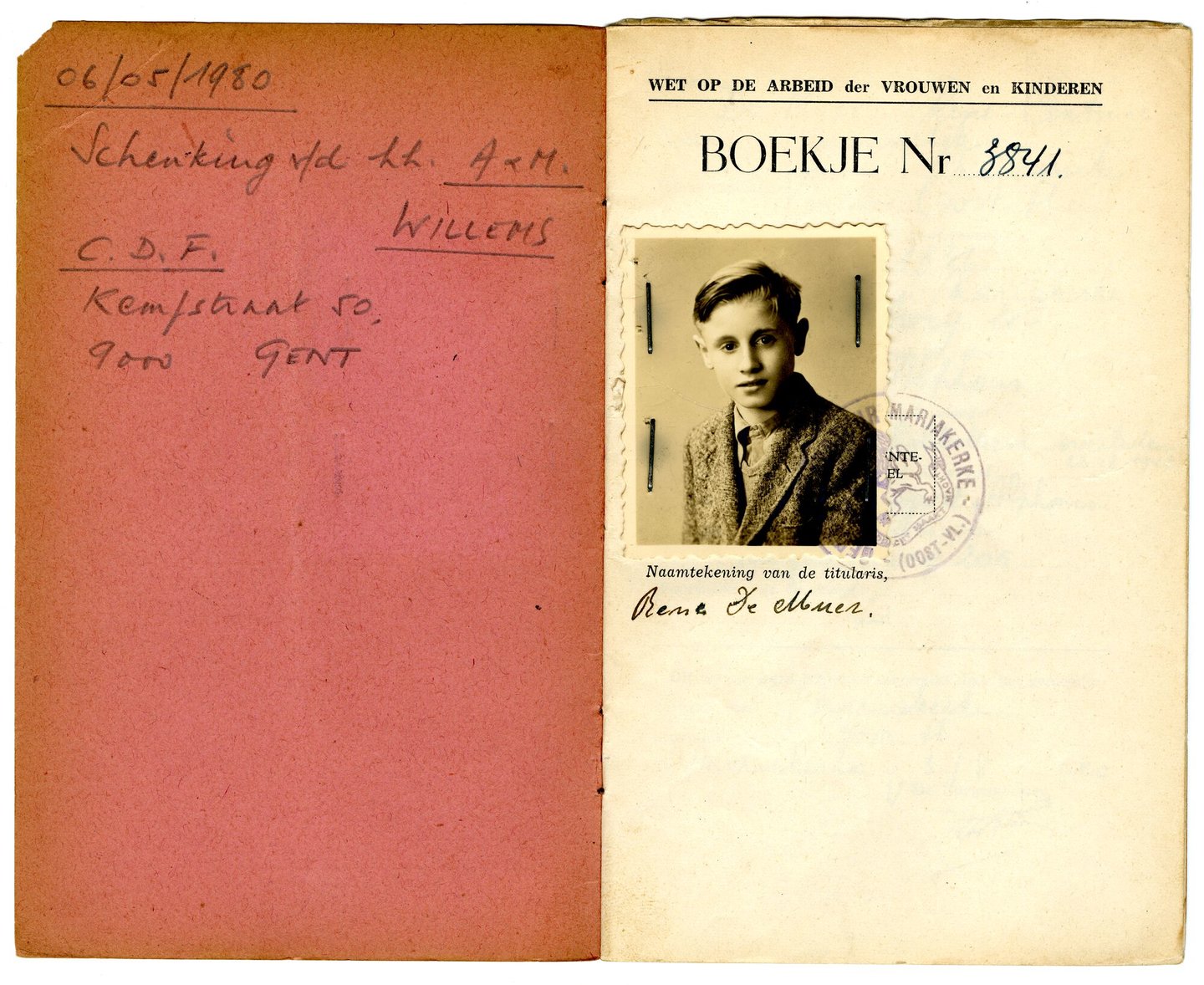 Vrouwen- en kinderarbeidswetboekje uitgereikt door gemeentebestuur van Mariakerke aan René-Antoine De Muer, geboren op 26 mei 1936, man, 14 jaar. Datum van afgifte van het boekje: 08/08/1950. Nummer van het boekje: 3841.