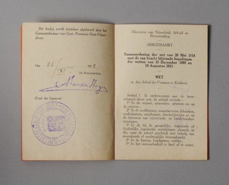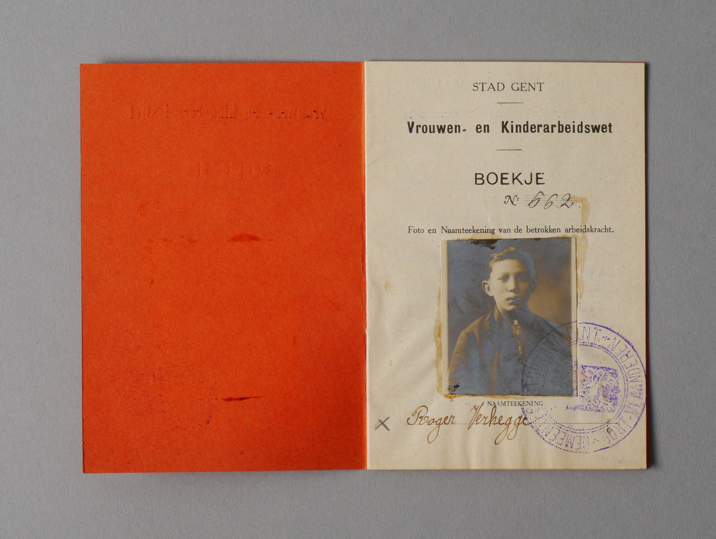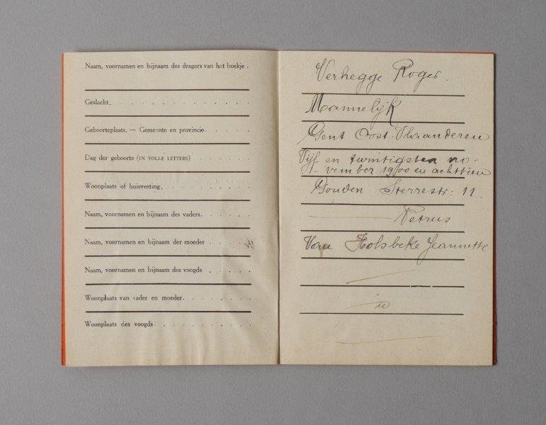 Vrouwen- en kinderarbeidswetboekje uitgereikt door gemeentebestuur Gent aan Roger Verhegge, geboren op 25 november 1918, man, 14 jaar. Datum van afgifte van het boekje: 25 november 1932. Nummer van het boekje: 662.