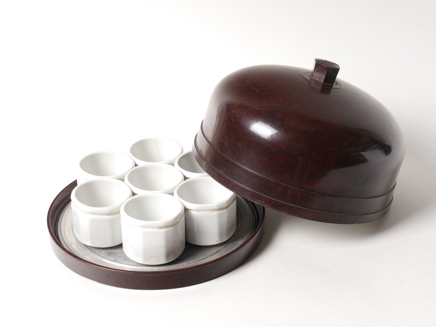 Thermische stolp uit fenolhars (bakeliet) met potjes in wit aardewerk van het Franse merk Yalacta. Binnenwerk uit blank aluminium. Gebruikt voor het maken van yoghurt.