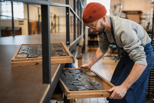 Van 1 januari tot 30 juni 2025 resideerde graficus Jan Vermandere in de drukkerijafdeling van het Industriemuseum. Hij dook er in de houten lettercollectie om TypeFaces of lettergezichten te maken.Jan experimenteert met letters en bevrijdt ze van hun traditionele functie. Hij probeert ze een stem te geven, een gezicht als het ware. In een eerste fase van zijn residentie onderzocht hij de lettercollectie van het museum; letters verzamelen, zoeken, schikken en ordenen. Daarna volgde het echte drukwerk. Daarbij speelt Jan met letters in een grafische opmaak. Op die manier creëert hij een TypeFace dat zo eenvoudig is in vorm en compositie dat je de letters niet meer opmerkt.