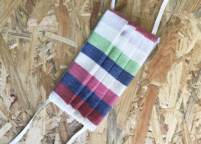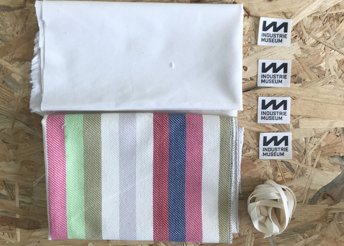Elk pakket bevat stukken stof en lint om vier mondmaskers mee te maken volgens het officiële patroon. De stoffen zijn geweven in het Industriemuseum en bestaan uit 100% katoen. Hierdoor kunnen ze gewassen worden op 60 graden.