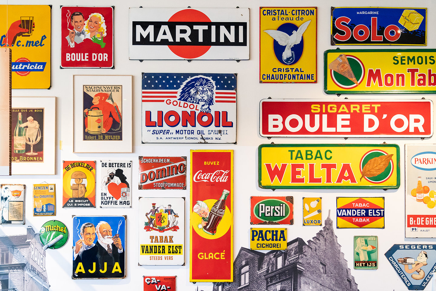 Een wand vol affiches en geëmailleerde borden toont de evolutie van reclame doorheen de tijd.