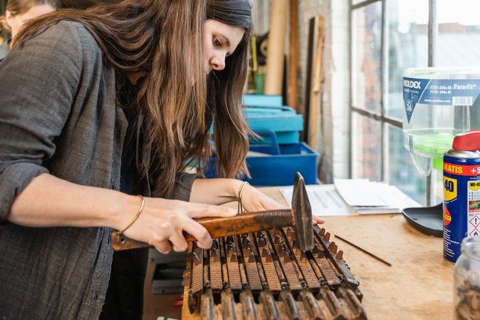 “Om een nieuw patroon te weven, moeten er houten pinnen in houten gaatjes geslagen worden. Niet elk pinnetje past in elk gaatje, waardoor het een erg arbeidsintensief werkje is om een nieuwe binding te ontwerpen. Patronen aanpassen komt dus neer op veel trial-and-error met de nodige frustratie af en toe. (knipoogt) We zijn aan het bekijken of dit proces niet efficiënter kan, alle ideeën zijn welkom.”
