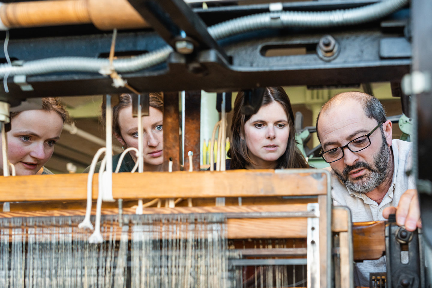 Sinds februari 2022 vind je regelmatig enkele enthousiaste textielontwerpsters achter de weefmachines in het Industriemuseum. Ze volgen er een meester-leerlingtraject bij collega Oktay Sancak. Meester-leerlingentrajecten werden door de Vlaamse overheid in het leven geroepen om immaterieel erfgoed te borgen voor de toekomst: een volleerd meester in een bepaalde techniek geeft z’n kennis en kunde – die je niet in boeken vindt, maar in hoofden en handen van mensen – door aan nieuwe generaties. Omdat slechts weinig mensen vandaag de dag nog weten hoe oude schietspoelweefmachines werken, zoals die in het Industriemuseum, geeft Oktay nu zijn kennis door aan textielontwerpsters Valerie Tjantele, Charlotte Cardyn en Jente Hendrickx. Tijdens het leertraject wordt alle kennis minutieus gedocumenteerd zodat de opgedane kennis niet verloren gaat. Zowel met Oktay als met Jente gingen we onlangs in gesprek.