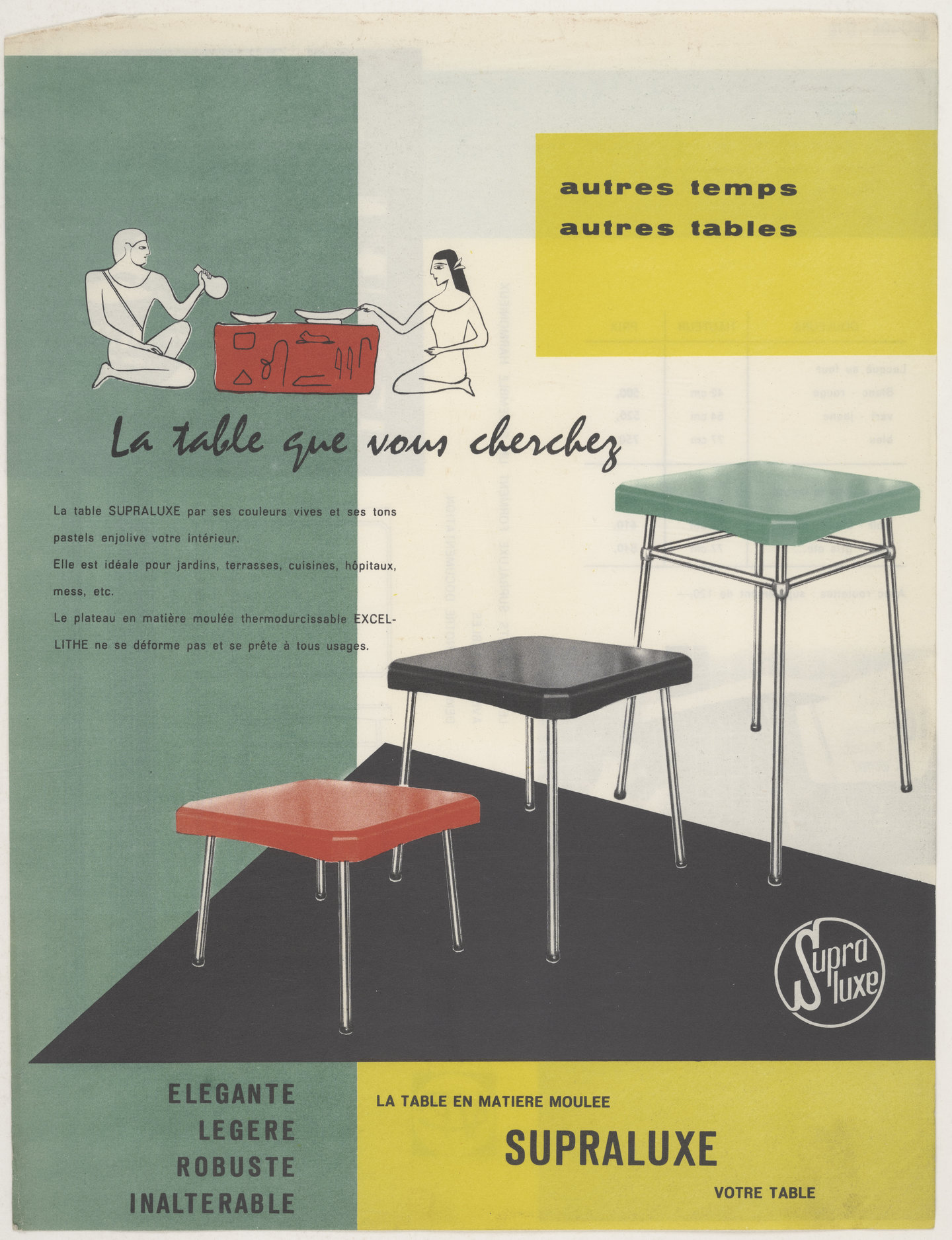 Tijdens het werk botste Marit op een Franstalige verkoopsflyer voor tafeltjes gemaakt bij Vynckier Frères & Compagnie in Gent. Het gaat over een rechthoekig krukje in bakeliet uit de Supra Luxe reeks, steunend op vier verchroomde poten. Bij de herstructurering van de Vynckiersite in 2021 werd zo’n wit tafeltje aan het Industriemuseum geschonken.