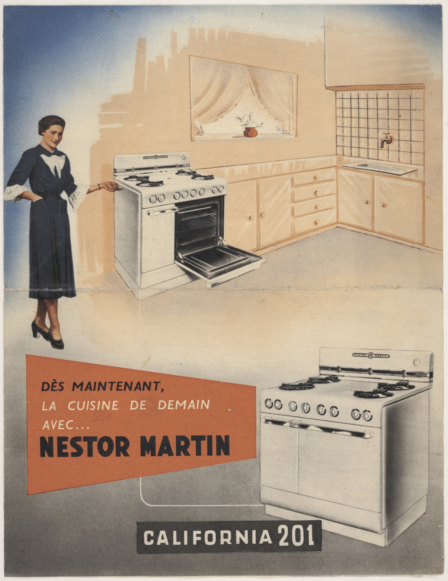 Een Franstalige productfolder van een gasfornuis dat zich ook effectief in de collectie bevindt? Dat vindt Marit telkens weer fijn om te verwerken. Het gaat om een productfolder van het merk Nestor Martin, types California 201 en 211. Zo’n geëmailleerde gasfornuis met vier branders, een oven en een bordenverwarmer, type California 230, wordt ook bewaard in het museumdepot. Het stamt uit het derde kwart van de 20e eeuw. Het valt Marit op hoe hard de focus in dergelijke productfolders voor huishoudelijke apparaten ligt op de vrouw aan de haard.