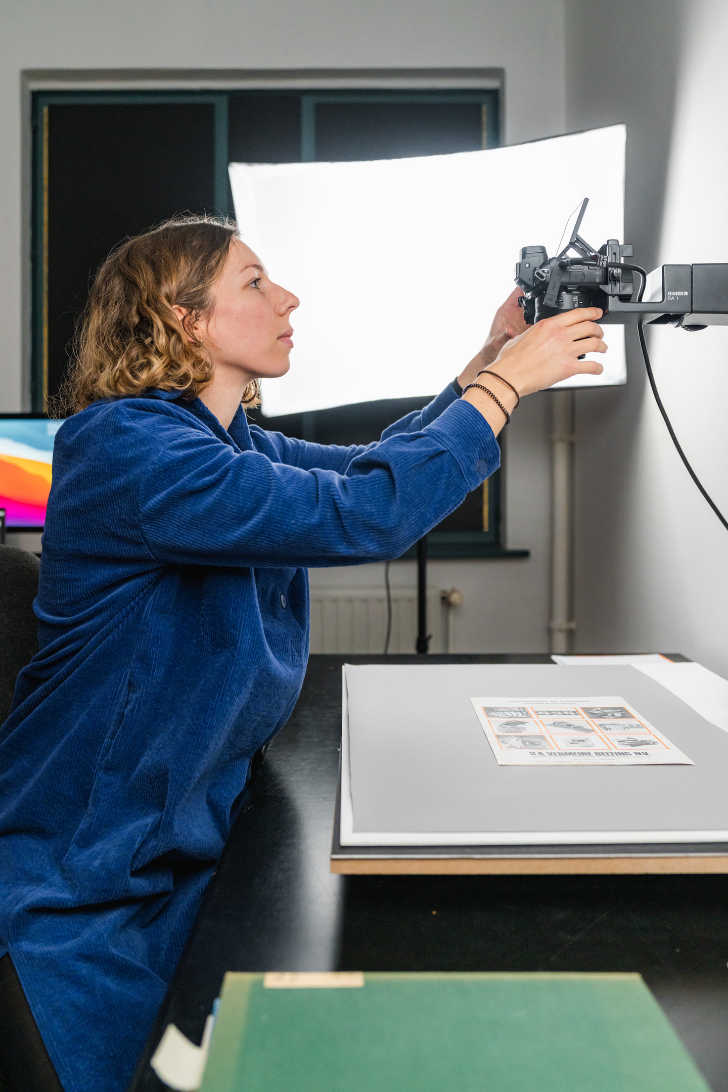 Na de basisregistratie volgt het digitaliseren. Met een fototoestel bevestigd aan een reprostand nemen we foto’s van de documenten. We verbinden de camera met Lightroom op de computer, zodat we vanuit het programma de voorinstellingen kunnen maken, rechtstreeks de foto’s kunnen nemen en nabewerkingen uitvoeren. Dankzij het fototoestel van 50 megapixels zijn de afbeeldingen van een veel hogere kwaliteit dan wanneer je een scanner gebruikt. We gebruiken deze opstelling ook voor andere 2D-objecten uit de collectie: foto’s, artikels, maar bijvoorbeeld ook dia’s en fotonegatieven. Via Lightroom verwerken we vervolgens de beelden die we maakten. We snijden het beeld bij en linken dit beeld aan de gegevens die we eerder – tijdens het registreren – invoerden in Axiell. Die reprostand is overigens nog niet zo lang aanwezig in het museum. Tot voor kort namen we scans of we besteedden de opdracht uit aan externen. De aankoop van de reprostand heeft ervoor gezorgd dat we nu in eigen huis snelle en kwalitatieve digitale beelden kunnen maken. Na het fotograferen steken we de documenten ten slotte in een nieuwe verpakking, zoals nieuwe hoesjes en zuurvrije dozen. Die dozen krijgen een standplaats die we dan ook toevoegen in Axiell zodat elk document gemakkelijk terug te vinden is. Op elke doos staat ook een barcode: wanneer je die scant, kan je zien welke collectiestukken allemaal in de doos zitten.”