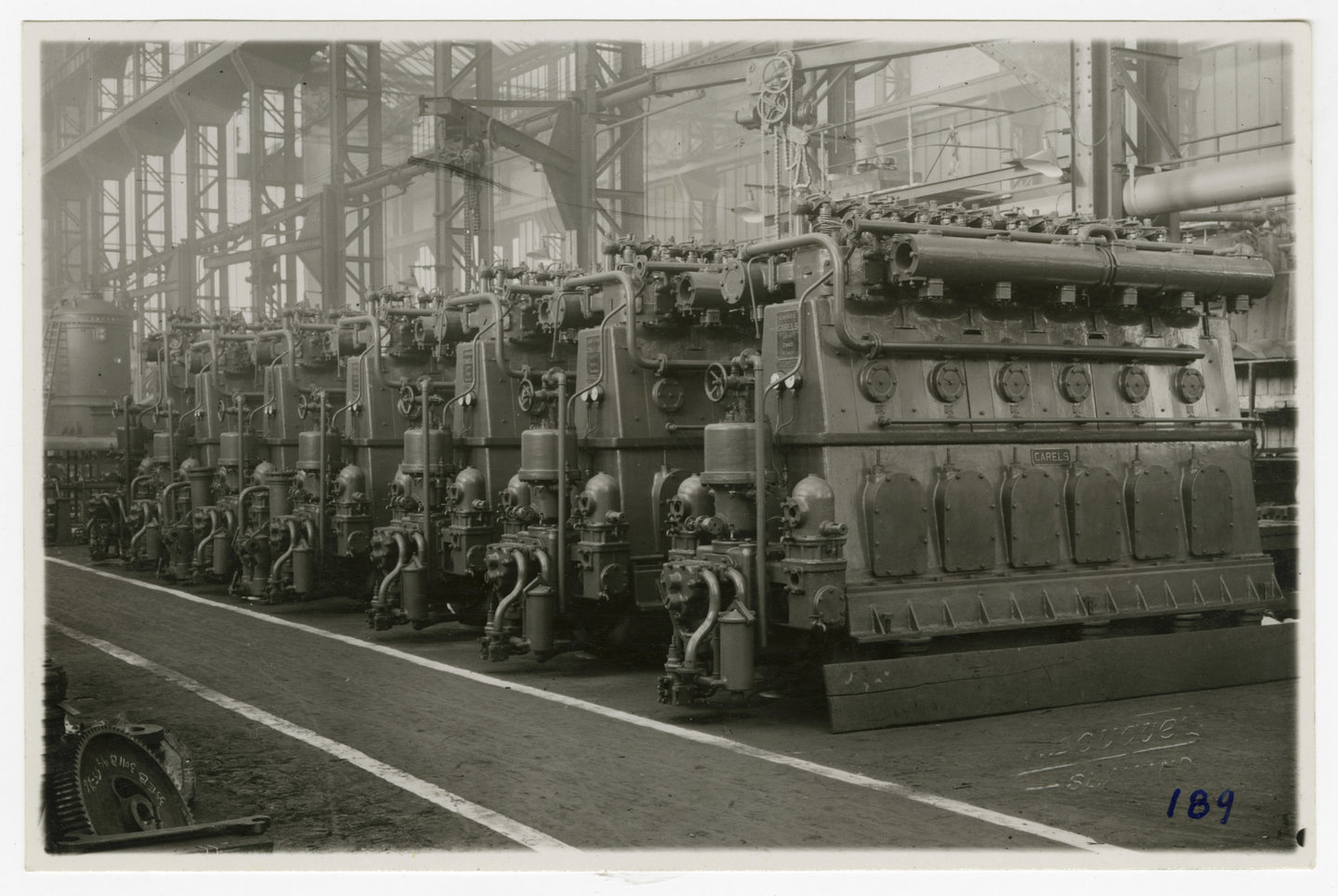 Een reeks afgewerkte dieselmotoren staat opgesteld in een montagehal op de site. Collectie Industriemuseum, F10203-087.
