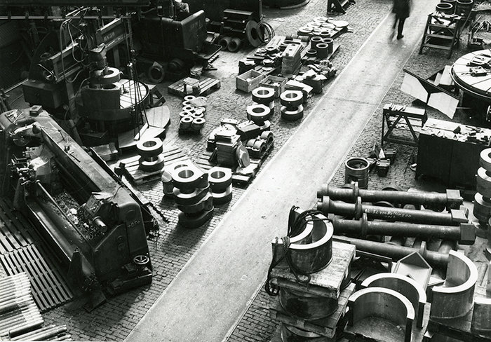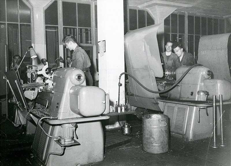 Een bankwerker of paswerker bedient een draaibank in een werkplaats op de site. Foto, 1954. Collectie Industriemuseum, F10223-007.