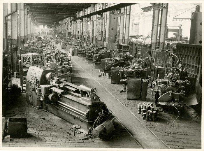 Interieur van twee werkplaatsen op de site met diverse metaalbewerkingsmachines en onderdelen, waaronder draaibanken. Collectie Industriemuseum, F10213-010 en F10256-005.