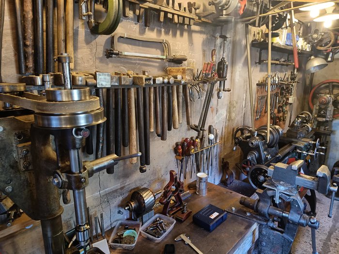 In het atelier roepen de vormgeving van de machines, het geluid van klapperende riemen, de geur van olie … stuk voor stuk de sfeer op van een werkplaats van weleer. Van de vroege 19e eeuw, waarin elektriciteit nog geen evidentie was en de meeste machineparken werden aangedreven door een waterrad of stoommachine. In Yannicks atelier levert een centrale elektromotor de nodige energie. Via een complexe wirwar van lederen riemen aan het plafond wordt die energie overgedragen op aandrijfwielen en vervolgens op elk werktuig. Het is Yannicks grote droom om het drijfwerk in z’n atelier ooit aan te sluiten op een originele stoommachine.